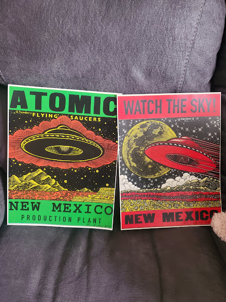 We decided to finally hit up the top floor and found “artist alley” Then, success! I found the only artist that was not selling fandom artwork! Don’t get me wrong, there were plenty of talented artists there all selling amazing artwork, but that was not specifically what I was looking for. The man I met made etchings on a hard surface then did a print transfer onto paper, making these amazing prints. He focused on New Mexico themed artwork that showcased UFOs and robots. These were unique, dark, and incorporated my home state, which I loved. They were the perfect thing that I was hoping for. I bought my two favorite prints and asked him to sign them.