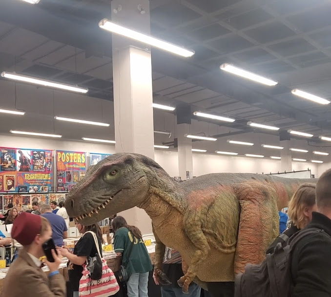 Down the street, we find Marble Brewing, a leader in New Mexico craft beer, and have a good time catching up (Yay for side quests!). Off to try the convention center, and another long line again…We find parking and decide to just bite the bullet where we stand for about an hour to get in. Finally, we get in and….so…many…people. I am not a huge fan of crowds, so this got to me. It was elbow to elbow in these rooms. We shuffled around in a human train line to see all the vendors. The two main rooms on the ground floor were strictly toys, posters, memorabilia, and a little candy. I did see a giant dinosaur costume, which was the highlight of these rooms for me. At this point I was getting a little disappointed that I hadn’t really seen any original artwork yet.
